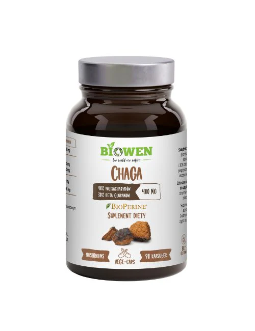 Chaga Biowen to naturalne wsparcie odporności i witalności organizmu. Każda kapsułka zawiera 400 mg ekstraktu z grzyba Chaga (Inonotus obliquus), standaryzowanego na 40% polisacharydów i 30% beta-glukanów. Formuła wzbogacona o BioPerine® zwiększa przyswajalność składników aktywnych. Produkt w pełni wegański, pozbawiony sztucznych dodatków i wypełniaczy.