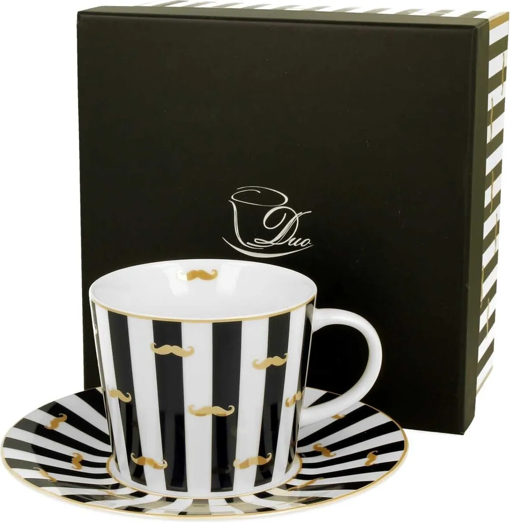 Porcelanowy kubek „Wąsy” to elegancki i stylowy dodatek, który świetnie sprawdzi się jako prezent. Delikatny motyw pasków w połączeniu ze złotym wzorem wąsów nadaje mu oryginalnego charakteru i przyciąga wzrok. To wyjątkowy element, który wprowadza do wnętrza nutę klasy i humoru.